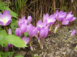 It is usually the corms of Colchicum autumnale or perhaps C.byzantinum that you will find at the garden centre in the fall. Quite often they will be flowering right in their package as nothing holds them back from their seasonal display. The flowers are light purple although white is sometimes offered. It would be a shame if people are put off from enjoying this beautiful late season flower in their garden due only to its association with medicine.